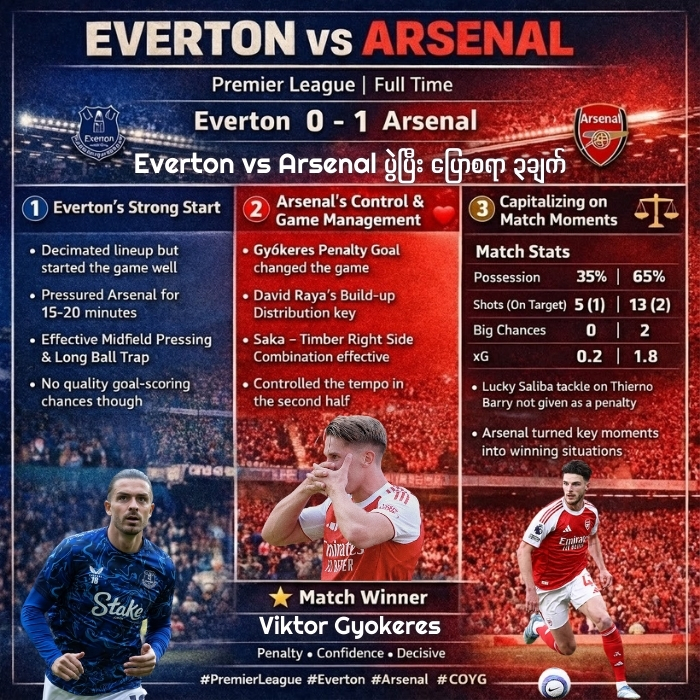 Arsenal အသင်းဟာ Hill Dickinson ကွင်းမှာ Everton ကို အနိုင်ယူပြီး Manchester City အသင်းကို နှစ်မှတ်အသာနဲ့