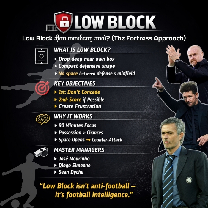 Low Block ဆိုတာ အသင်းတစ်သင်းက ဘောလုံးဆုံးရှုံးလိုက်ရတဲ့အချိန်မှာ (Out-of-possession) ကိုယ့်ဘက်က