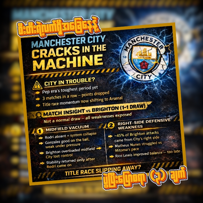 မန်စီးတီးရဲ့ လက်ရှိအခြေအနေဟာ Pep Guardiola ခေတ်မှာ အဆိုးရွားဆုံးလို့တောင် ပြောလို့ရတဲ့ စိန်ခေါ်မှုတစ်ခုနဲ့ ရင်ဆိုင်နေရတာပါ။ မနှစ်ကပိုဆိုးတာမဟုတ်ဘူးလားလို့မေးရင် ဟုတ်ပါတယ် မနှစ်ကပိုဆိုးတာပါ။ ဒါပေမယ့် Pep ရဲ့ စီးတီးဟာ မနှစ်က လွဲလ်ို့၊ ဒီနှစ် ရာသီ၊ ဒီလို ဖလားလုရတဲ့အခြေနေမျိူးမှာ ဘယ်တော့မှ အမှတ်လျော့ခဲ့တဲ့အသင်းမဟုတ်ပါဘူး။ ခုတော့ ၃ပွဲဆက် အမှတ်လျော့ခဲ့ပြီး ဖလားကို အာဆင်နယ်လက်ထဲ အပ်ရမယ့်အခြေနေကိုရောက်ပြီလို့ဆိုရပါမယ်။ ဘရိုက်တန်နဲ့ပွဲမှာ ၁-၁ သရေကျခဲ့တာဟာ စီးတီးအတွက် ရိုးရိုးတန်းတန်း အမှတ်လျော့တာမျိုးမဟုတ်ဘဲ အသင်းရဲ့ အားနည်းချက်တွေ အကုန်လုံး အပြင်ကို ထွက်လာတဲ့ပွဲလို့ မြင်ပါတယ်။ အဓိကအားဖြင့် ဒဏ်ရာရကစားသမားတွေရဲ့ ထိုးနှက်ချက်ဟာ စီးတီးအတွက် “နံပါတ်တစ်” ရန်သူဖြစ်နေပြီး ဒါဟာ ချန်ပီယံဆုကို လက်လွှတ်ရမယ့်အထိ ကြီးမားတဲ့ အကြောင်းရင်း ဖြစ်လာနိုင်ပါတယ်။ ဘရိုက်တန်နဲ့ပွဲမှာ […]